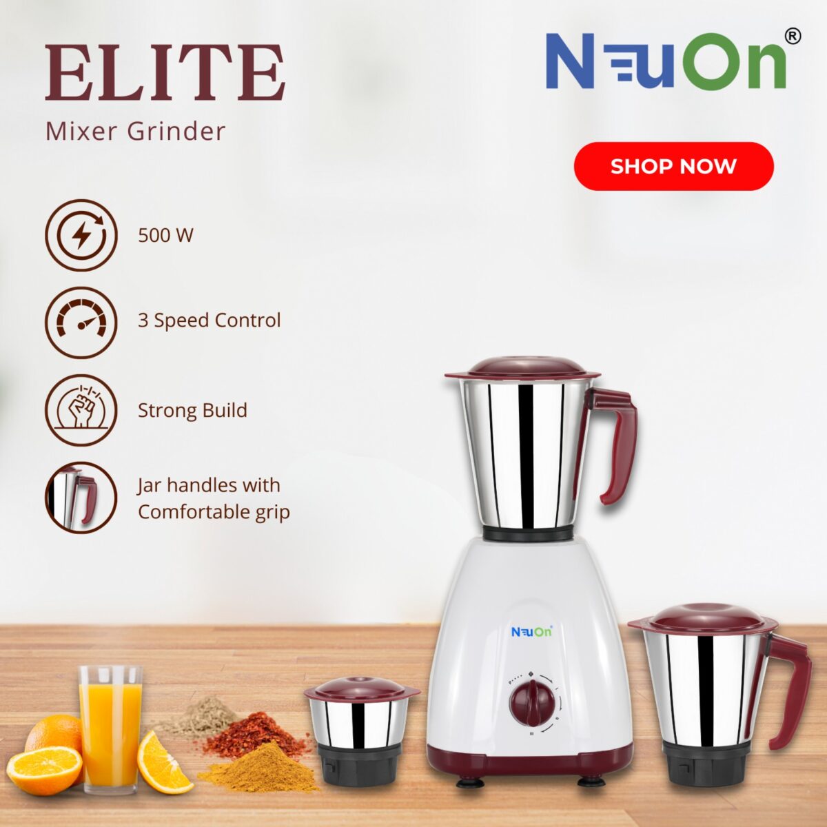 - Multiple Jars: Comes with three stainless steel jars of different sizes (1.2 Ltr liquid jar, 0.8 Ltr dry jar, and 0.3 Ltr chutney jar) for versatile grinding and blending needs.